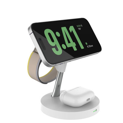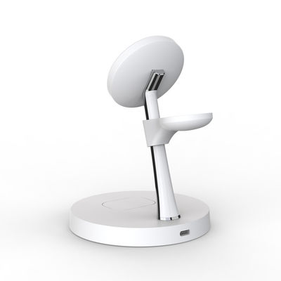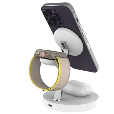 This product is a Qi standard all-in-one multi-functional magnetic fast wireless charger, which can supportiPhone12/13/14/15 series magnetic featured phones, Apple Watch, Samsung Watch, other QI standard mobile phones,Airpods and Samsung TWS.It is a convenient and practicable smart electronic device. The magnetic part of this product adopts magnetic coil design. You can place the phone vertically or horizontally while charing the phone. When you watch your favorite videos while charging, you can adjust the charging part up and down to find the proper angle.The product is designed with the magnetic double coil, those Multiple Angles are adjustable, and you can place the phone vertically or horizontally without affecting charging.